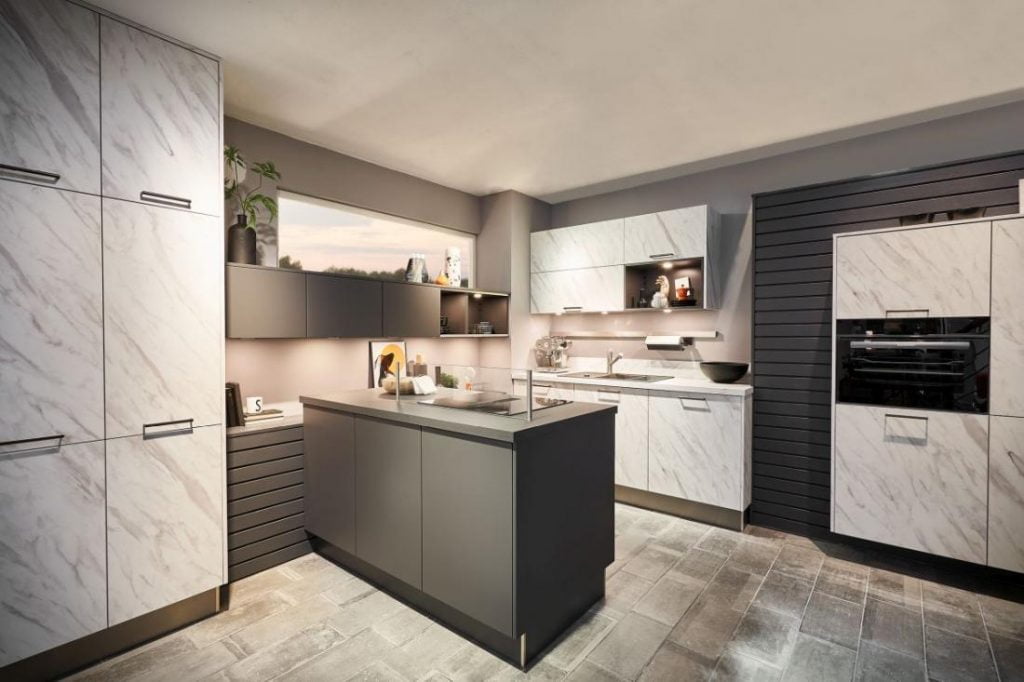 Merkur to linia frontów odzwierciedlająca kolorystykę kamienia. Wykończona warstwą matowego lakieru ma niepowtarzalny wygląd i idealnie gładką powierzchnię. Tworzy wyśmienity efekt wizualny! Dzięki warstwie lakieru utwardzonego UV charakteryzuje się również wysoką odpornością na uszkodzenia. W tym roku 2021 nowością są dwa nowe kolory w linii frontów Merkur: Carrara white (biały marmur) oraz Marble Gray (szary marmur). Jasny kolor mebli z ciekawym kamiennym wzorem to doskonały pomysł na aranżacje małej kuchni. Delikatny wzór odzwierciedlający marmur nie przytłoczy wnętrza nawet jeśli w projekcie będzie zastosowany na większej powierzchni.