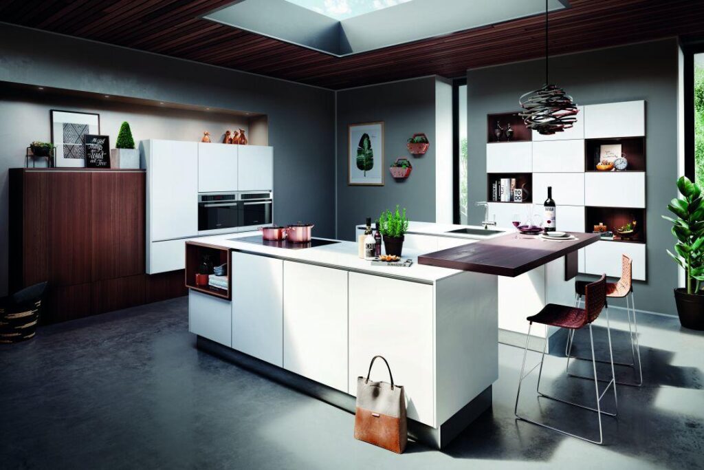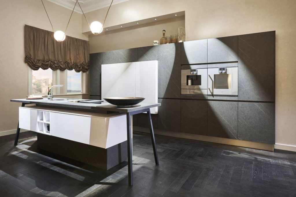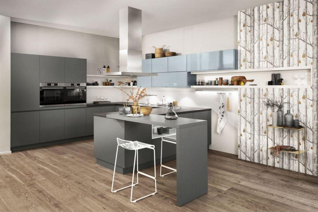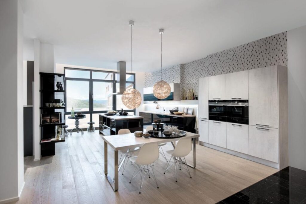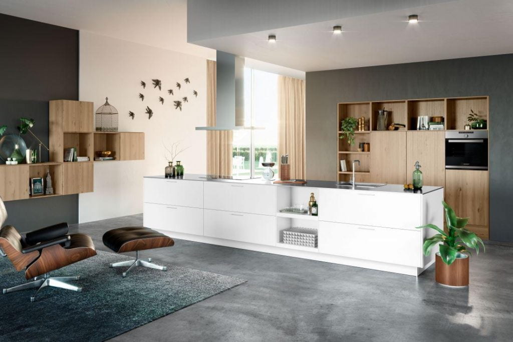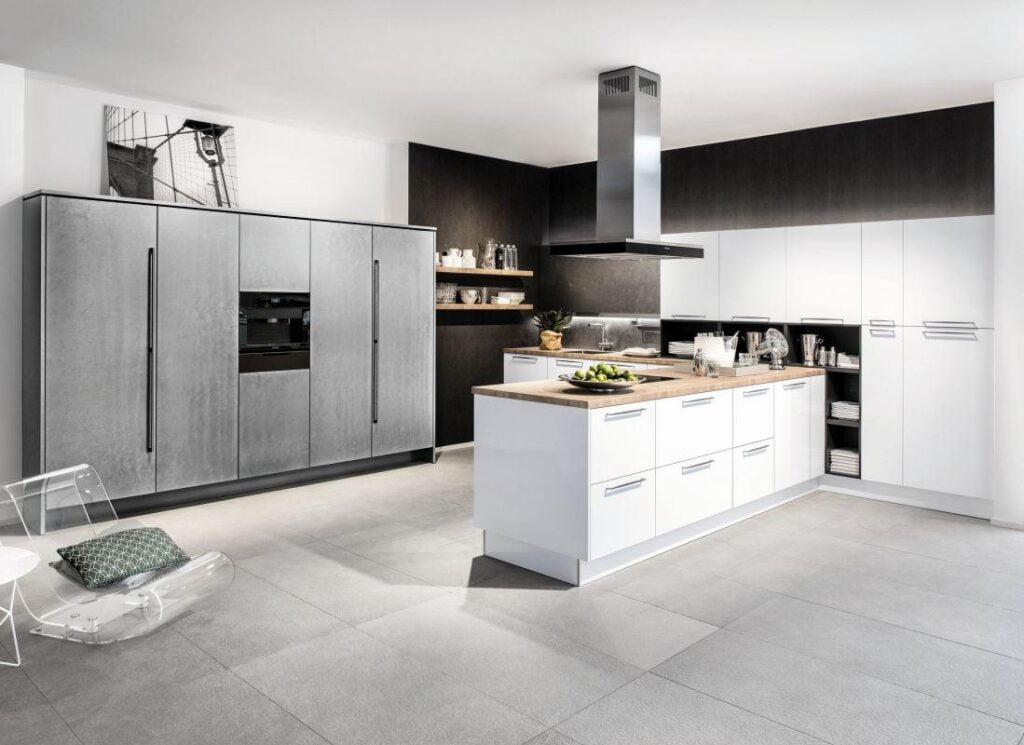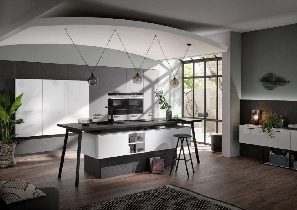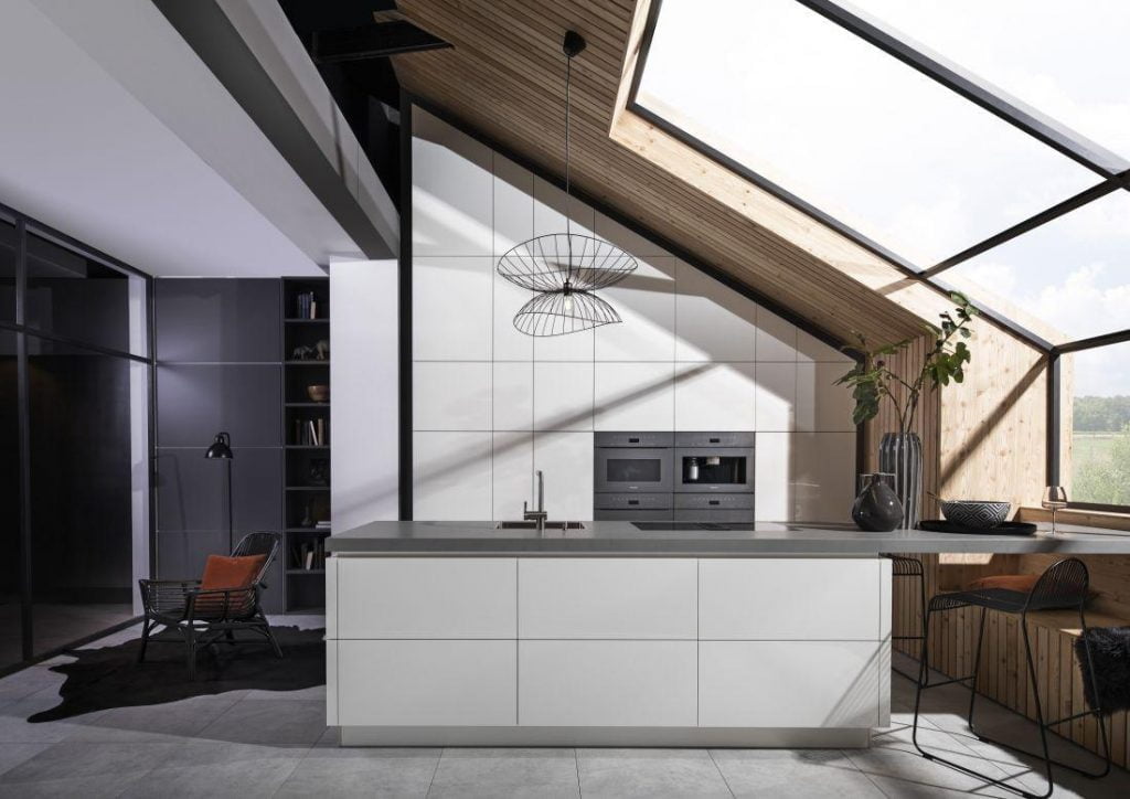 Niemieckie kuchnie w stylu nowoczesnym charakteryzują się nietypowymi połączeniami form i materiałów oraz ciekawą kolorystyką. Białe fronty w wysokim połysku zestawione z matową szarością z linii AV2045 odzwierciedlającą barwę naturalnego marmuru, to propozycja na stylowe kombinacje kolorystyczne od kuchnie haecker! Oba odcienie efektownie ze sobą współgrają, a przy tym każdy z nich nadaje wnętrzu elegancji. To również świetne tło do podkreślenia niestandardowej konstrukcji wyspy kuchennej. Jej wielowymiarową forma efektownie podkreślają meble o gładkich frontach.