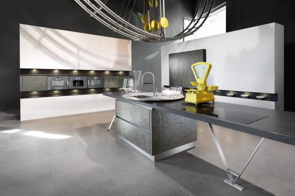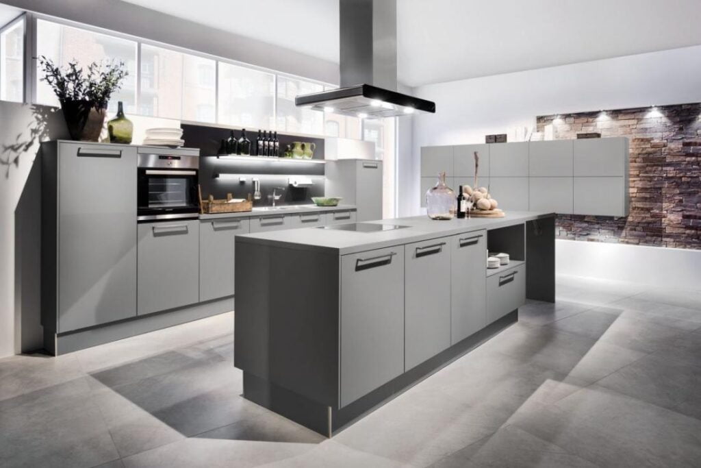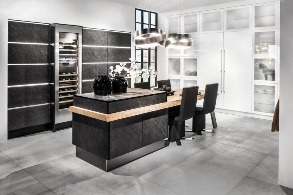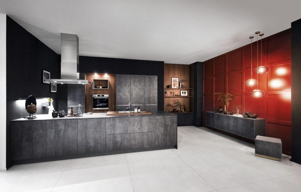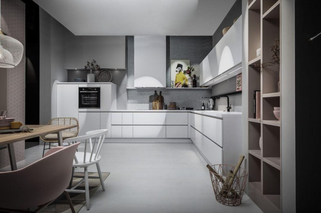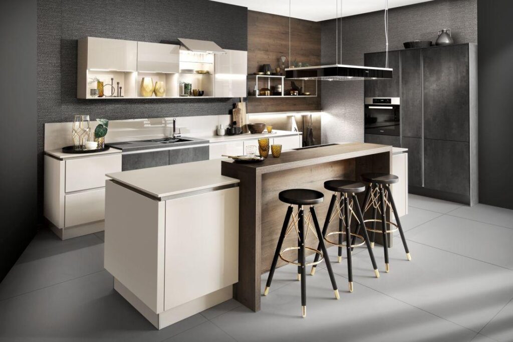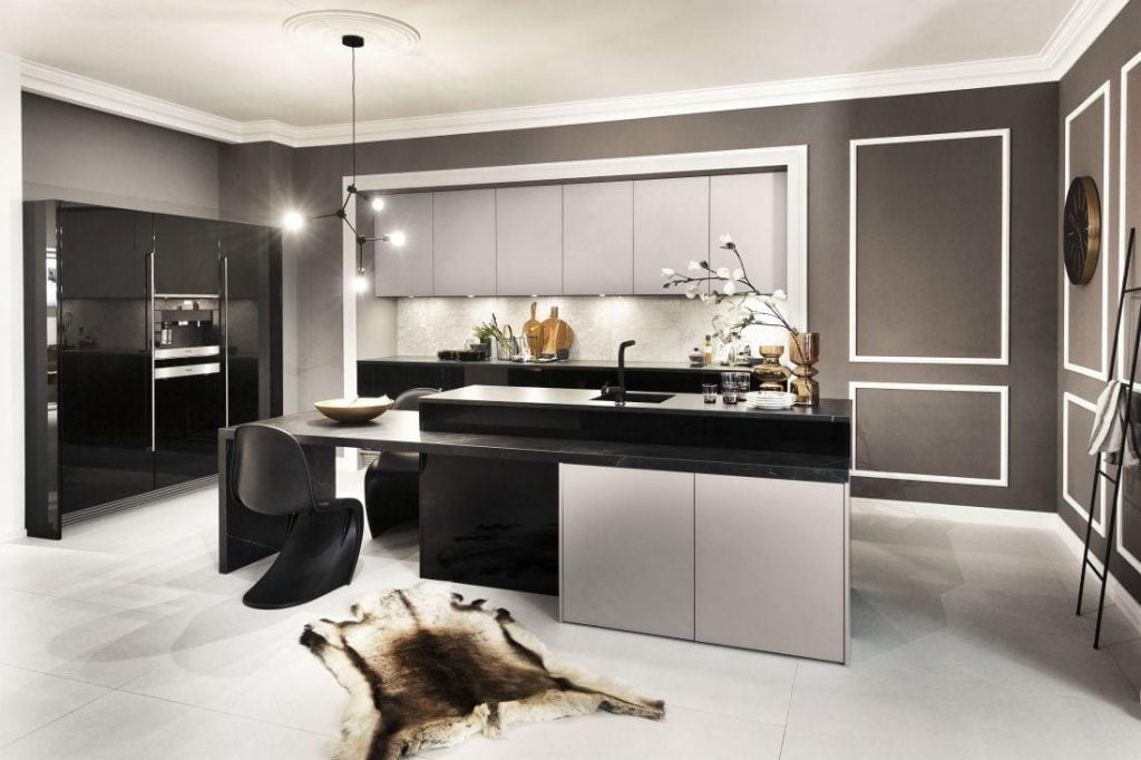 Niemieckie kuchnie w stylu nowoczesnym charakteryzują się nietypowymi połączeniami form i materiałów oraz ciekawą kolorystyką. Białe fronty w wysokim połysku zestawione z matową szarością z linii AV2045 odzwierciedlającą barwę naturalnego marmuru, to propozycja na stylowe kombinacje kolorystyczne od kuchnie haecker! Oba odcienie efektownie ze sobą współgrają, a przy tym każdy z nich nadaje wnętrzu elegancji. To również świetne tło do podkreślenia niestandardowej konstrukcji wyspy kuchennej. Jej wielowymiarową forma efektownie podkreślają meble o gładkich frontach.
