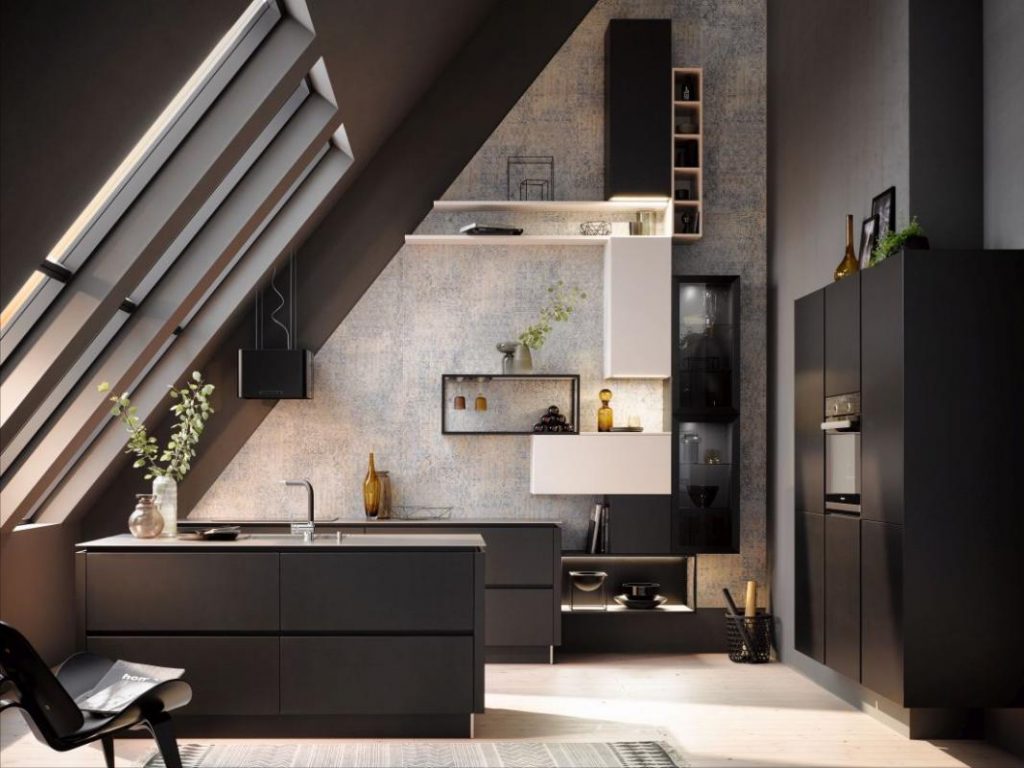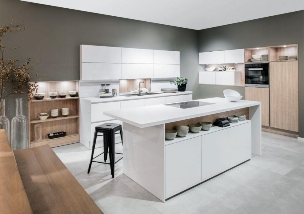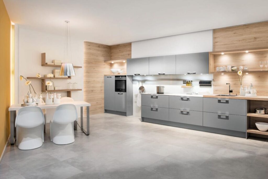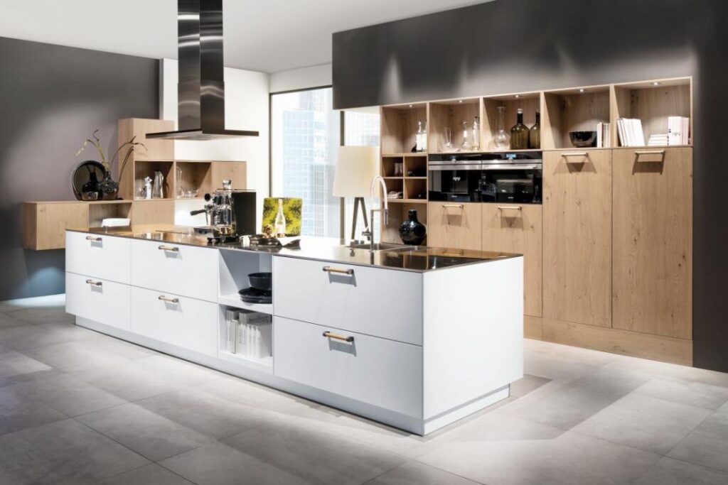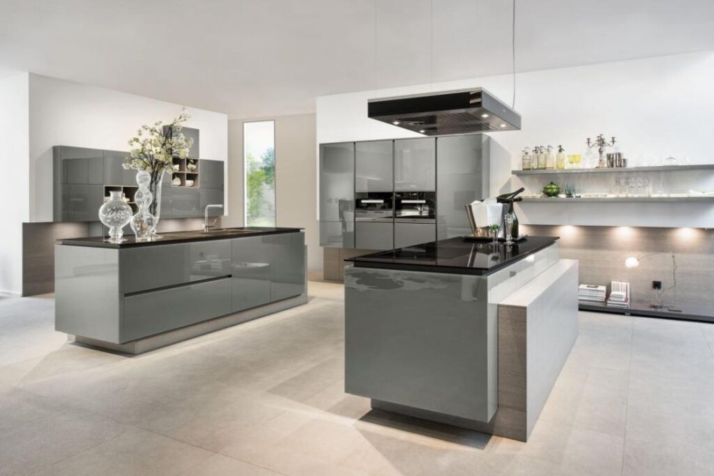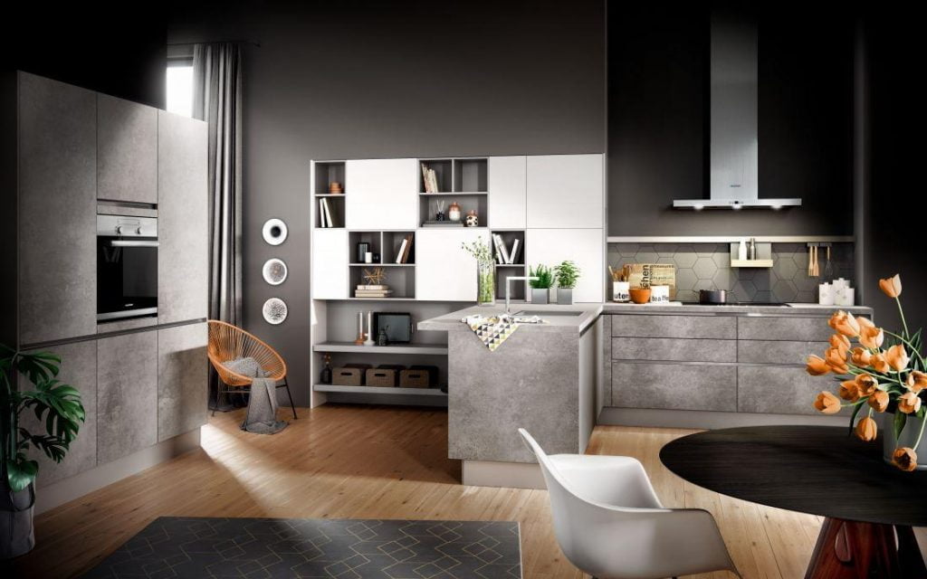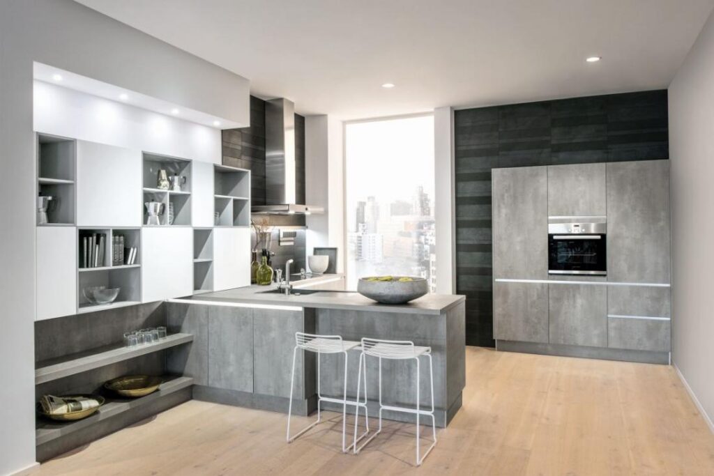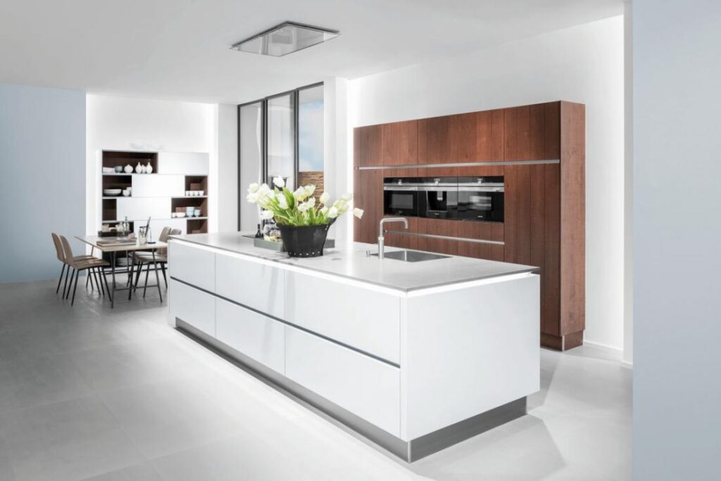 Niemieckie kuchnie w stylu nowoczesnym charakteryzują się nietypowymi połączeniami form i materiałów oraz ciekawą kolorystyką. Białe fronty w wysokim połysku zestawione z matową szarością z linii AV2045 odzwierciedlającą barwę naturalnego marmuru, to propozycja na stylowe kombinacje kolorystyczne od kuchnie haecker! Oba odcienie efektownie ze sobą współgrają, a przy tym każdy z nich nadaje wnętrzu elegancji. To również świetne tło do podkreślenia niestandardowej konstrukcji wyspy kuchennej. Jej wielowymiarową forma efektownie podkreślają meble o gładkich frontach.