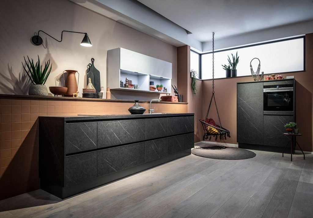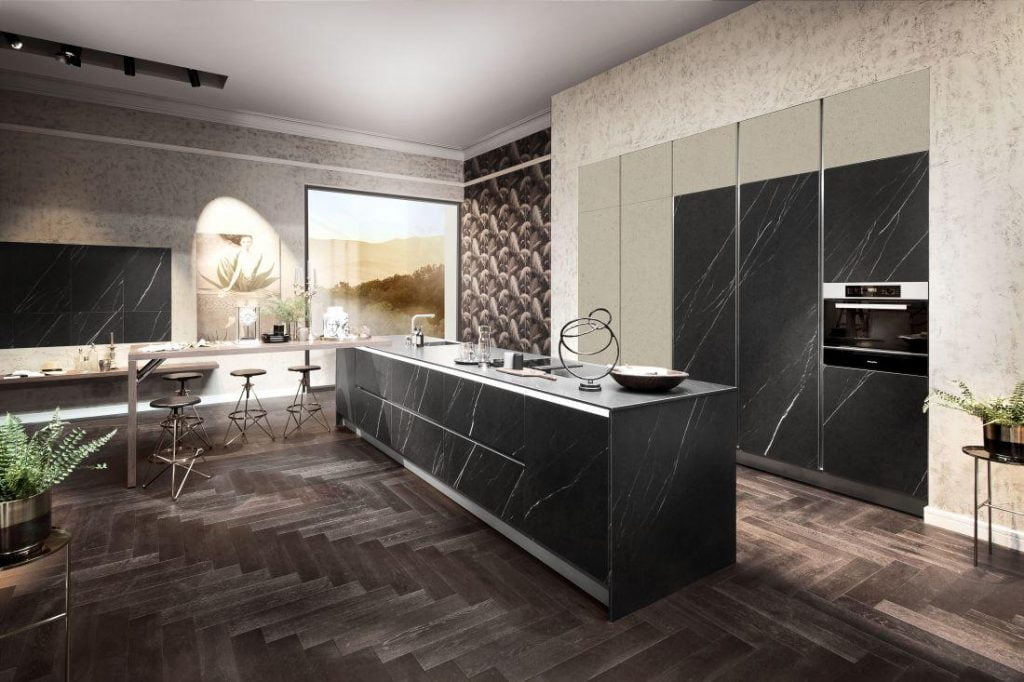 Czy ciemna kuchnia może prezentować się ciekawie i z pomysłem? Udowadniamy, że tak i polecamy <strong style=font-weight:400;”>niemieckie kuchnie hacker</strong>! Jedną z możliwości aranżacji oryginalnego wnętrza jest wykorzystanie w nim frontów o niejednorodnej barwie np. z linii Merkury w odcieniu Marmor dunkel. Cechą, która charakteryzuje te wyjątkowe fronty jest nawiązanie do kolorystyki ciemnego, naturalnego marmuru. Jasne żyłki – cecha charakterystyczna tych frontów, subtelnie rozświetlają powierzchnię mebli, a przy tym przełamują ciemną kolorystykę kuchni. Ten i wiele innych ciekawych sposobów na urządzenie kuchni znajdziesz w naszej ofercie.