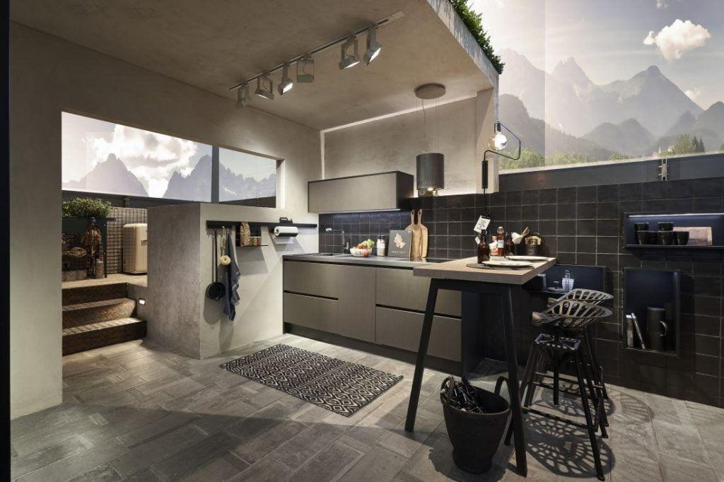 Naturalne fronty o ciekawej strukturze kamienia w zestawieniu z prostoliniowym, nowoczesnym wzornictwem. W centrum znajduje się duża wyspa kuchenna, która zestawiona jest ze stołem. Futurystyczne półki zaprzeczają prawom fizyki i są oryginalnym dopełnieniem aranżacji. Wymarzona kuchnia dla osób lubiących eksperymentować z aranżacją wnętrz